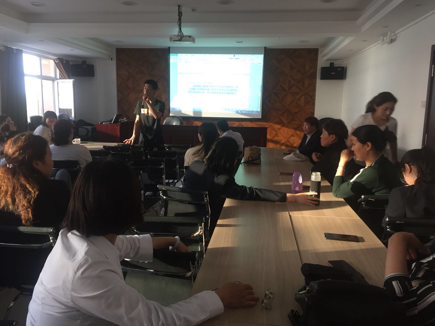 培訓(xùn)開始時(shí),主持人用簡潔的語言為大家介紹了“釘釘軟件考勤管理制度”包括使用原則考勤要求、考勤方式。