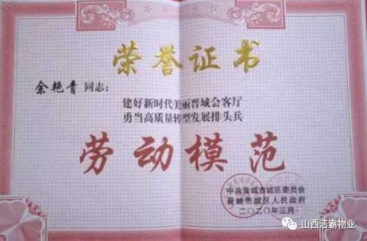 余艷青同志自2015年進(jìn)入潔霸以來,一直奮斗在工程部的第一線從事主管工作。工作中,余艷青同志愛崗敬業(yè),遵守職業(yè)道德,為人誠實(shí)守信;她熱愛工作,對待客戶熱情周到、耐心細(xì)致;工作中團(tuán)結(jié)同事,責(zé)任心強(qiáng),吃苦耐勞,服從大局,以公司的利益為重。在我市開展的“三洗六見一紅旗”活動和全國文明城市的創(chuàng)建活動中,她帶領(lǐng)員工高標(biāo)準(zhǔn)、高質(zhì)量、高效率地完成清洗美化工作,為扮靚晉城形象,打造城市優(yōu)美環(huán)境做出了突出貢獻(xiàn)。先后多次被公司評為優(yōu)秀員工等,2019年在公司成立20周年慶之際,她又被公司授予“潔霸工匠”稱號。