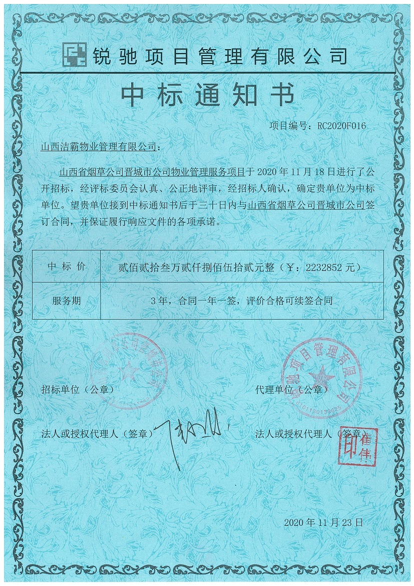 2020年11月18日,山西省煙草公司晉城公司物業(yè)管理服務(wù)項(xiàng)目開標(biāo)會議在晉城市文昌東街1560號南環(huán)供電營業(yè)站一樓東會議室舉行。在經(jīng)過幾個小時(shí)的激烈競標(biāo)過程評選后,從開標(biāo)室傳出喜訊,山西潔霸物業(yè)管理有限公司成功中標(biāo)。中標(biāo)金額為2232852元,合同期一年。此次中標(biāo)為潔霸物業(yè)今年的業(yè)績再添一筆輝煌。