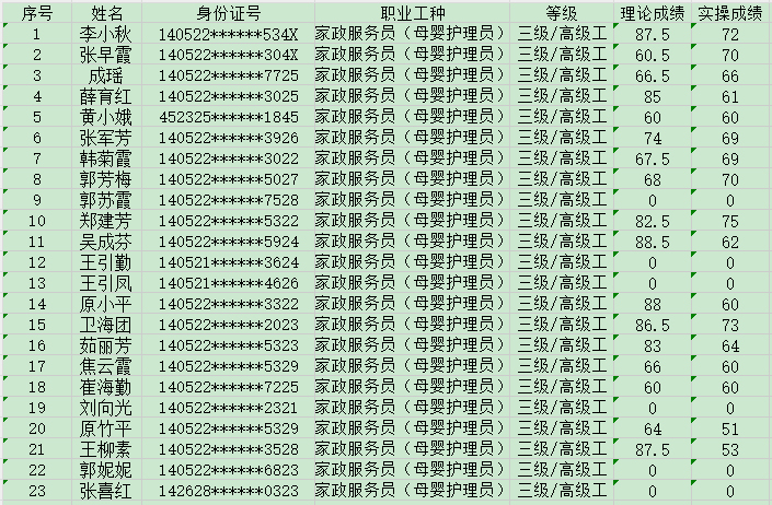 2024年5月20日上午第13批家政服務員高級認定人員成績公示