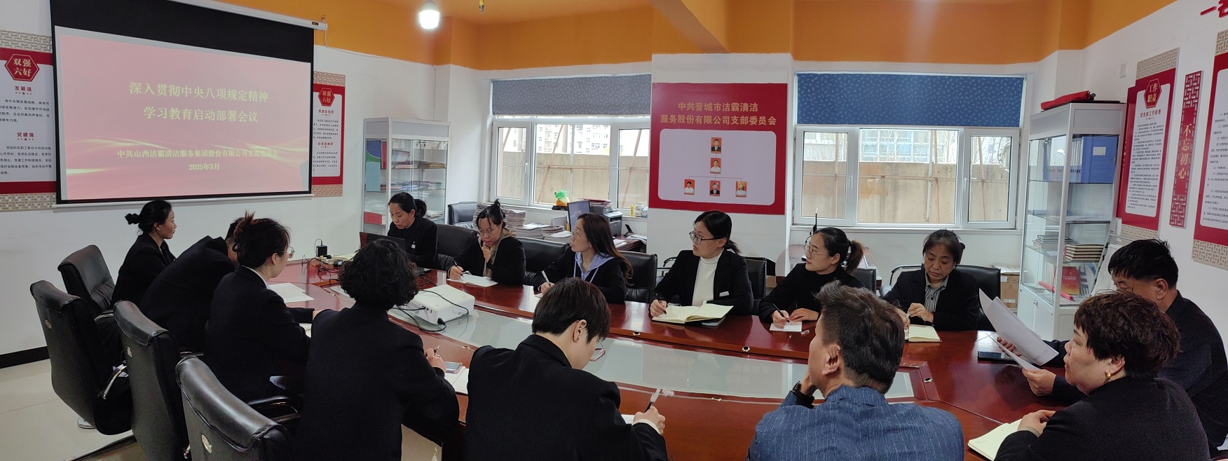 近日,山西潔霸清潔服務(wù)集團(tuán)股份有限公司黨支部召開專題會議,對公司開展深入貫徹中央八項規(guī)定精神學(xué)習(xí)教育進(jìn)行部署。支部書記程晉軍主持會議并講話。